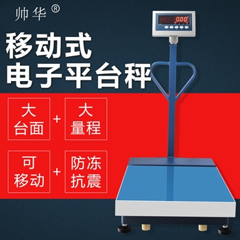 帥華移動式電子臺秤是全新設計的一種電子臺秤,將臺秤與托盤車結構有機結合而成,系統由臺秤、托盤車、移動機構、儀表立柱和支腳等組成;靜止和移動過程中都可以進行稱重,非常方便;儀表交直流兩用,可以配置打印機;特別適合物流、倉儲場合稱重。